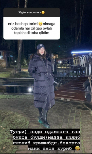 Актриса ответила на вопросы о своей личной жизни и о профессии. По словам Низомиддиновой, ее супруг старше нее на 12 лет. Актриса отметила, что раскроет личность своего супруга, когда он будет готов на этот шаг.