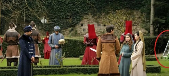 Еще один любопытный промах связан со сценой в дворцовом саду. На фоне пышных декораций и изящных костюмов в углу кадра скромно стоит стремянка. Она выглядит так, будто ее забыли убрать после съемок. Стремянка в саду султана — это, конечно, не то, что ожидаешь увидеть в историческом сериале. Поклонники предположили, что, возможно, кто-то из героев — например, Михримах-султан — решил использовать ее для романтического приключения, вроде сбора фруктов с высоких деревьев.