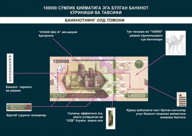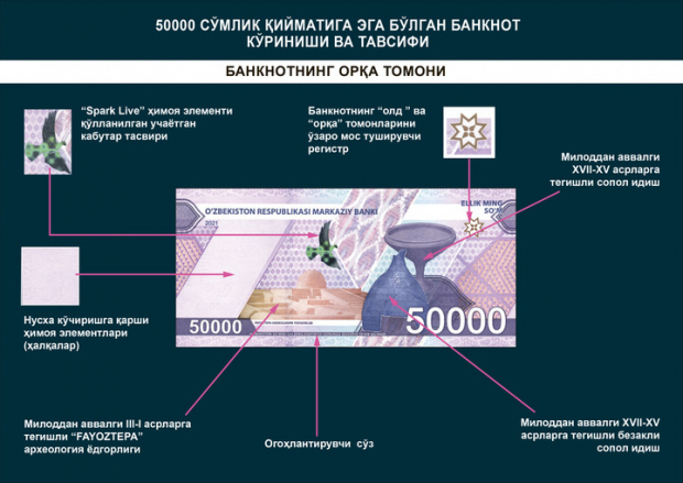 Дизайн купюр посвящен Великому шелковому пути и истории двух областей — Сурхандарьинской и Хорезмской. Купюры отпечатаны на защитной бумаге и с оборотной стороны покрыты специальным лаком.