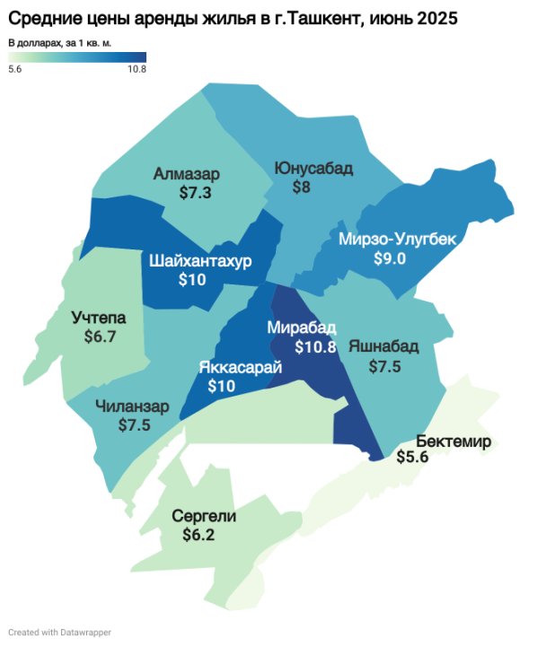 Рынок аренды жилья в Ташкенте в июне показал стабильность: средняя ставка аренды осталась на уровне $8,1 за квадратный метр. Наиболее высокие арендные ставки традиционно сохраняются в центральных районах, таких как Мирабад, Шайхантахур и Яккасарай, где средний уровень составляет около $10,3 за квадратный метр.