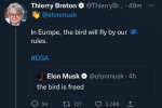 Еврокомиссар Тьерри Бретон, ответственный за внутренний рынок ЕС, намекнул Илону Маску, что его новое приобретение Twitter будет ограничено в своей