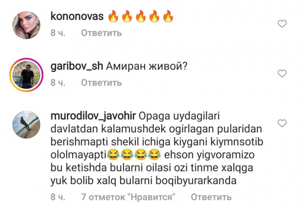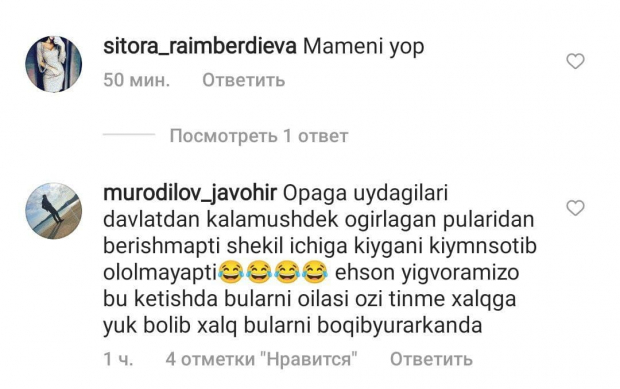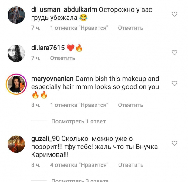 Тилляева и ее супруг посетили светское мероприятие в одинаковом образе - классическом смокинге. Узбекистанцы раскритиковали Марьям за фото в пиджаке без нижнего белья. Некоторые отшутились, что девушка не в первый раз выставляет фото без нижнего белья и предложили подарить ей комплект белья.