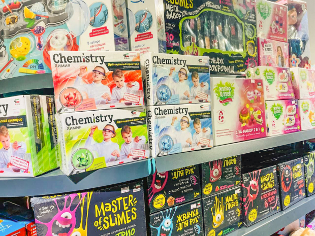 Можно играть и двигаться: в разнообразии представлены массажные коврики, помогающие запоминать цвета и развивающие координацию, сенсорику, логическое мышление. Легко окунуться в волшебный мир науки, самостоятельно создав зубную пасту для слона, стать настоящим парфюмером или участником других химических экспериментов.