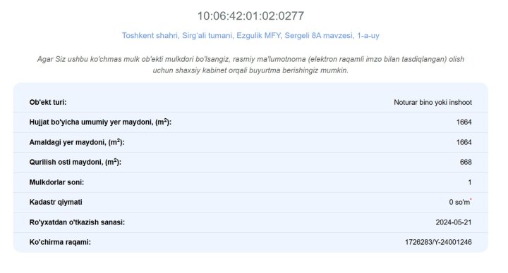 Согласно сведениям из госреестра данная организация является владельцем двух земельных участков в Сергелийском районе, кадастровая стоимость которых 0 сумов. Уставной капитал организации всего 3 560 962 сума. Основной деятельностью организации, по классификатору ОКЭД, являются услуги в области сухопутного транспорта. Плательщиком НДС компания не является.