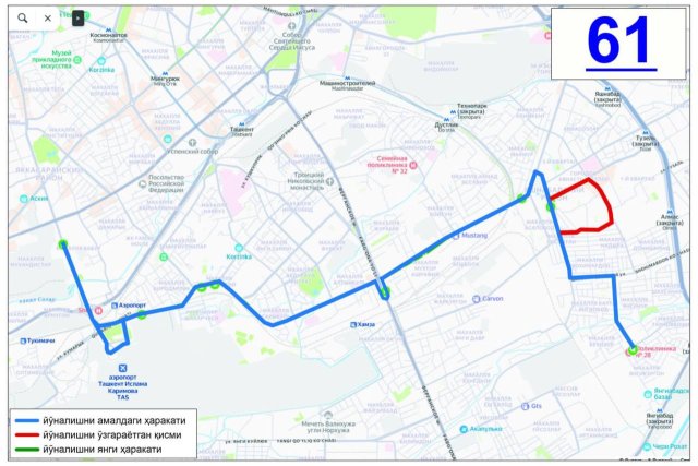 Маршрут №61: Этот маршрут теперь следует по улице Иззат в обоих направлениях, полностью исключая заезд на улицы Бешарик, Авиясозлар и Хосият.