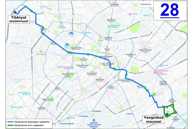 Маршрут №28: Направление от Медицинской академии к массиву Янгиабад теперь проходит по улицам Шохимардон, Охангарон йули, Шохсанам и Катта Янгиабад. Важно отметить, что по последней улице движение будет осуществляться только в одну сторону.