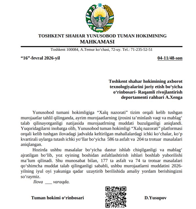 Мужчине скинули pdf-файл с официальным письмом заместителя хокима района в хокимият Ташкента. В письме заместитель хокима просит у хокимията Ташкента дополнительное время для решения вопросов с асфальтированием внутренних дорог (585 жалоб) и тротуаров (204 жалобы). Жители жаловались через портал "Халк назорати", но для решения вопроса нужно финансирование и время. Заместитель хокима в письме признается, что сроки выполнения работ нарушены. Стоит отметить, что в письме утверждается, что выделены средства для решений вопросов и разработана программа - ремонт дорог начнется летом текущего года.