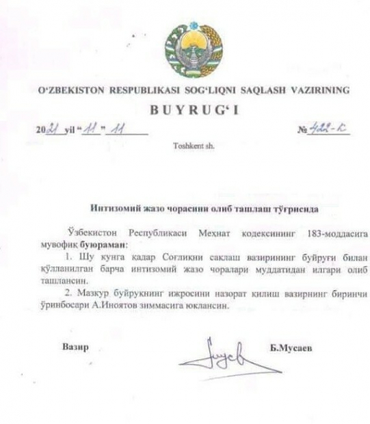 Приказываю досрочно отменить все дисциплинарные меры наказания, примененные до сегодняшнего дня министром здравоохранение, — отмечается в приказе.