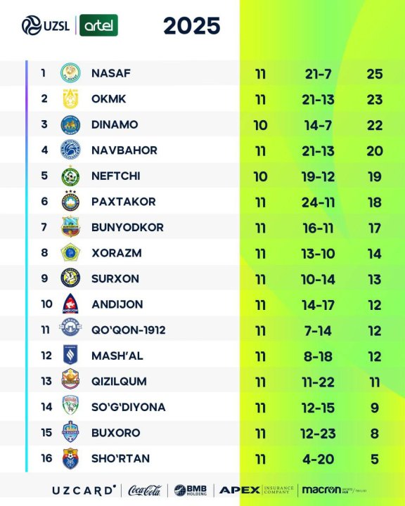 Алмалыкский АГМК, считавшийся одним из претендентов на медали, неожиданно потерял очки в игре против аутсайдера чемпионата - «Шуртана». Этот результат стал неожиданностью для болельщиков и экспертов. На фоне уверенной игры «Насафа» и «Динамо» АГМК постепенно теряет позиции в борьбе за первое место. Кроме того, команды из нижней части таблицы начинают оказывать давление, что усложняет положение алмалыкцев.